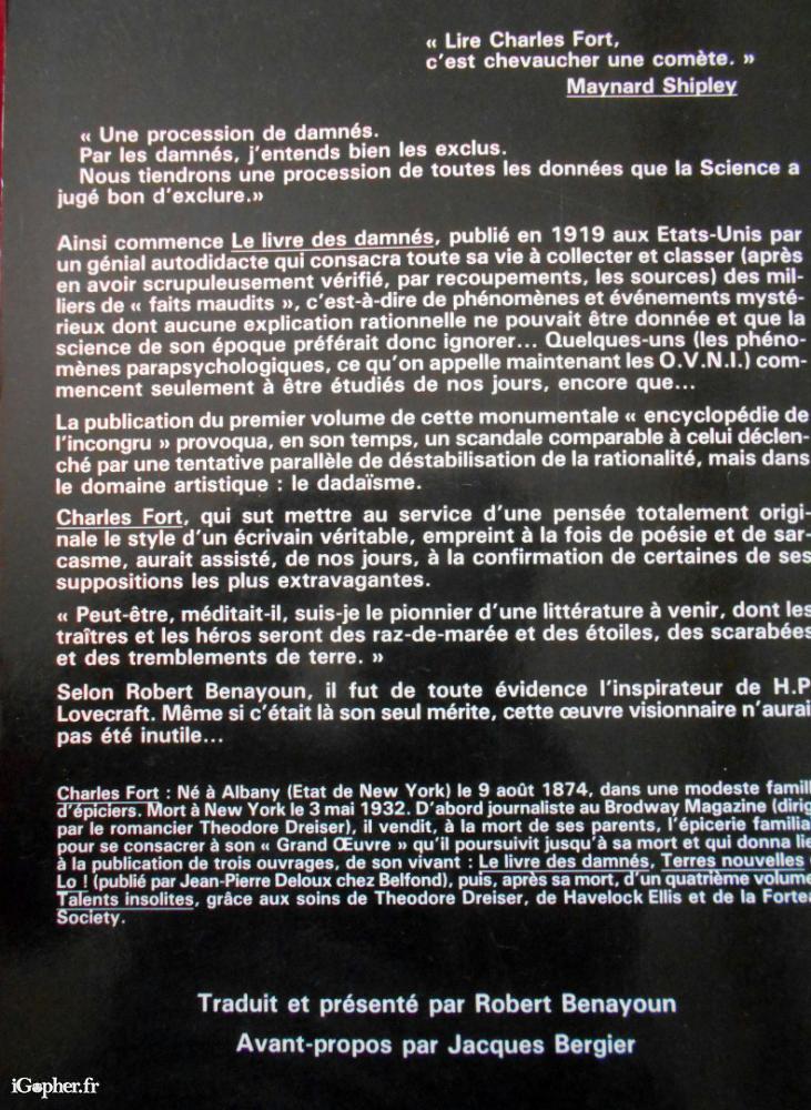 Ainsi commence Le livre des damnés, publié en 1919 aux Etats-Unis par un génial autodidacte qui consacra toute sa vie à collecter et classer (après en avoir scrupuleusement vérifié, par recoupements, les sources) des milliers de "faits maudits", c'est à dire de phénomènes et événements mystérieux dont aucune explication rationnelle ne pouvait être donnée et que la science de son époque préférait donc ignorer...