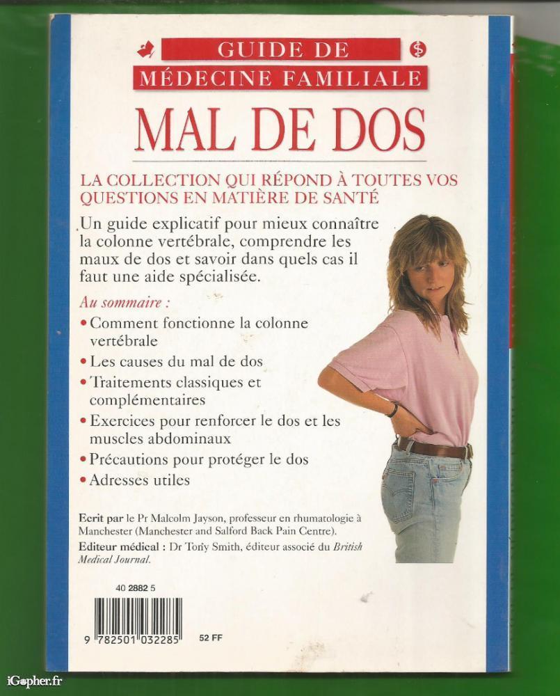 Un ouvrage du Professeur Malcolm JAYSON. Son livre titre : Mal de dos - Guide de médecine familiale - Symptômes - Tests - diagnostic - traitements - conseils - mode de vie.