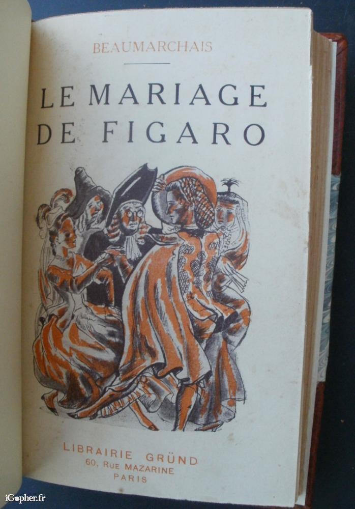 Ouvrage de BEAUMARCHAIS : Le mariage de FIGARO ou la folle journée. Livre relié de 232 pages publié à la Librairie GRUND en 1936.