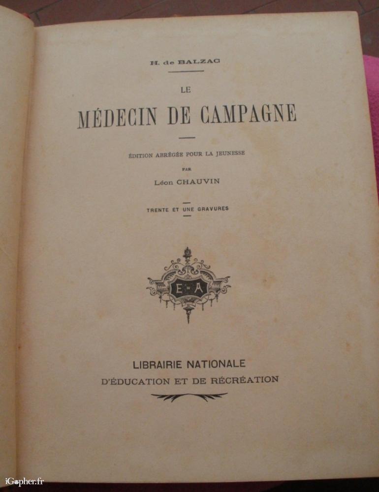 C'est un ouvrage écrit par H. de BALZAC, il titre : "Le médecin de campagne". Il s'agit d'une édition abrégée pour la jeunesse par Léon CHAUVIN. Elle est parue à la Librairie nationale d'éducation et de récréation.
