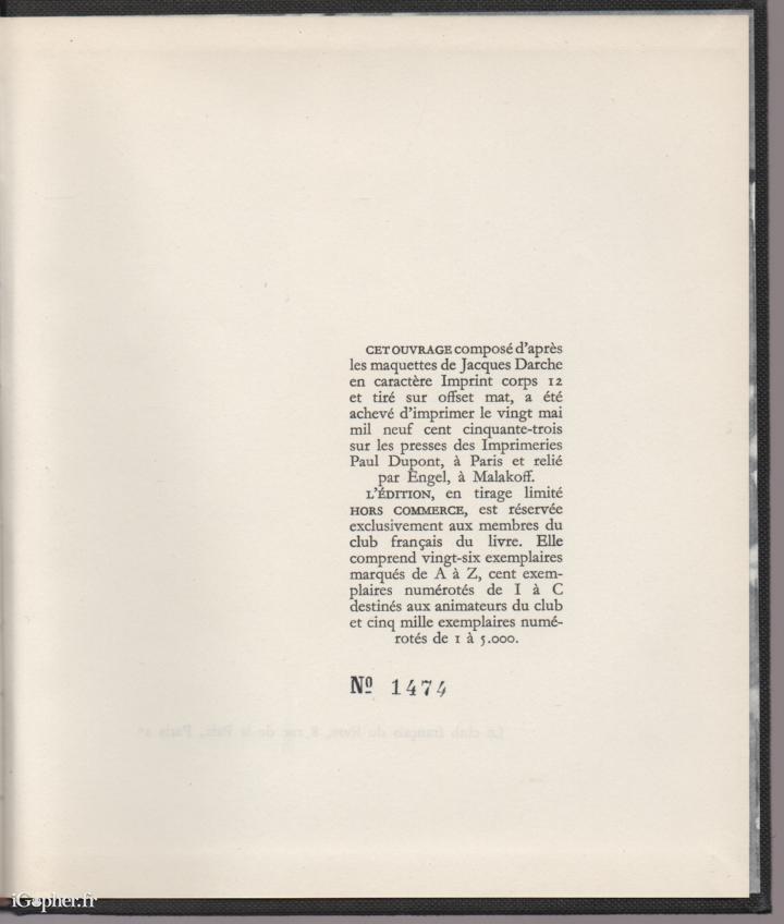Edité par "Le Club Français du Livre" (une collection numérotée), cet ouvrage de 198 pages porte le numéro 1474.