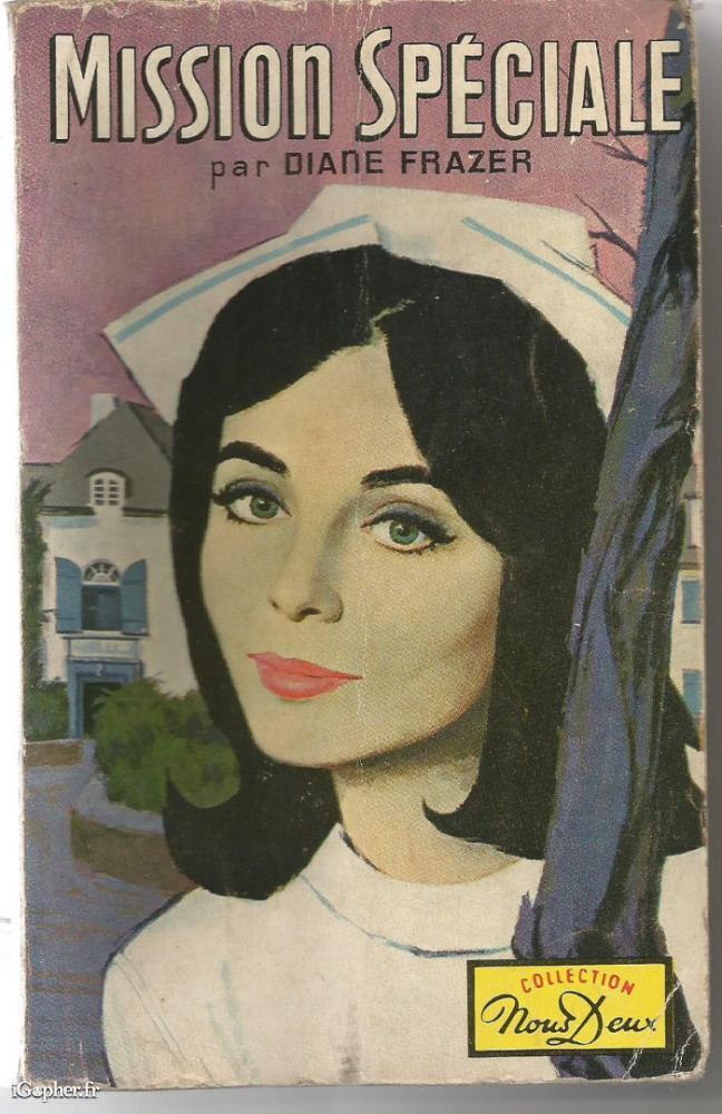 Ce livre titre : Mission spéciale (titre original : Confidential Nurse). Il a été écrit par Diane FRAZER et traduit de l'américain par G. H. GOLDET. Un livre de la collection NOUS DEUX paru aux éditions mondiales en 1964. Il comprend 221 pages.