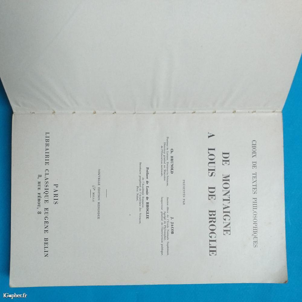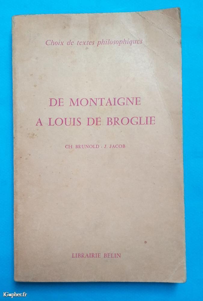 Ouvrage de Ch BRUNOLD et J JACOB, il titre : De Montaigne à Louis de Broglie . Choix de textes philosophiques. Livre d'un total de 492 pages en 1962 publié à la Librairie classique Eugène Belin.