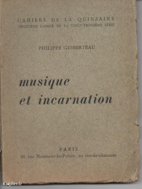 Un ouvrage écrit par Philippe GUIBERTEAU, il titre : MUSIQUE et INCARNATION - CAHIERS de la QUINZAINE, Cinquième cahier de la vingt troisième série.