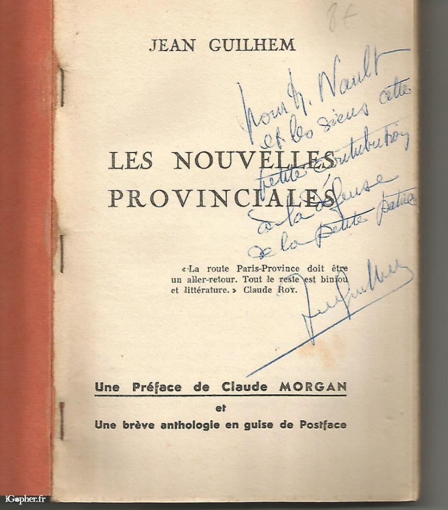 Un livre écrit par Jean GUILHEM et dédicacé par l'auteur. Il titre "Les nouvelles provincialesé et comprend une préface de Claude MORGAN et une brève anthologie en guise de postface.