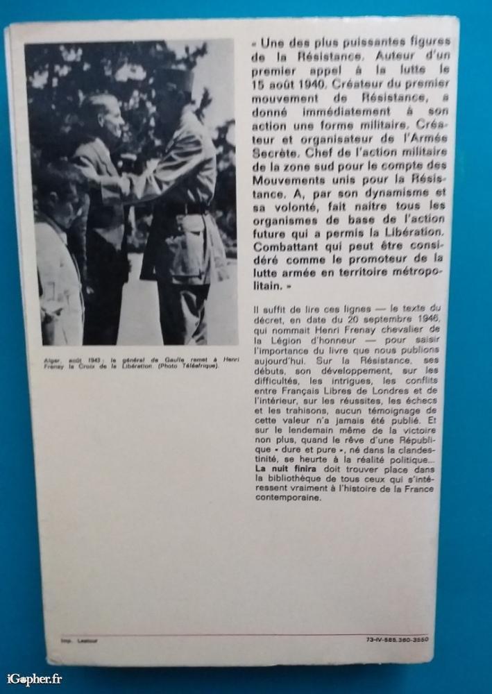 Livre : La nuit finira - Mémoires de Résistance 1940-1945 (Henri Frenay)