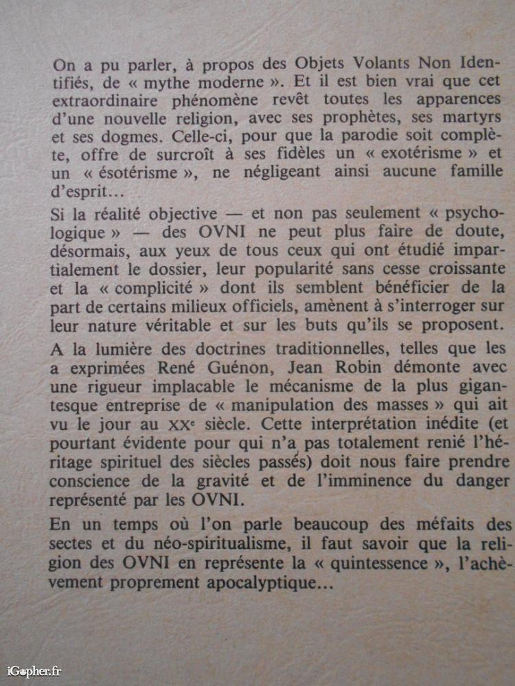 Ce livre titre "Les Objets Volants Non Identifiés ou la Grande Parodie". Un ouvrage écrit par Jean Robin.