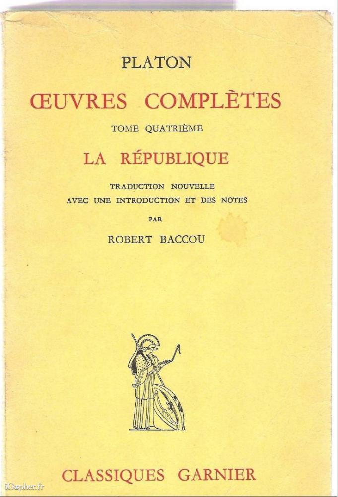 Les Oeuvres Complètes de PLATON, tome 4. Un des classiques GARNIER. Cet ouvrage a été publié en 1963. La république, traduction nouvelle avec une introduction et des notes de Robert BACCOU.