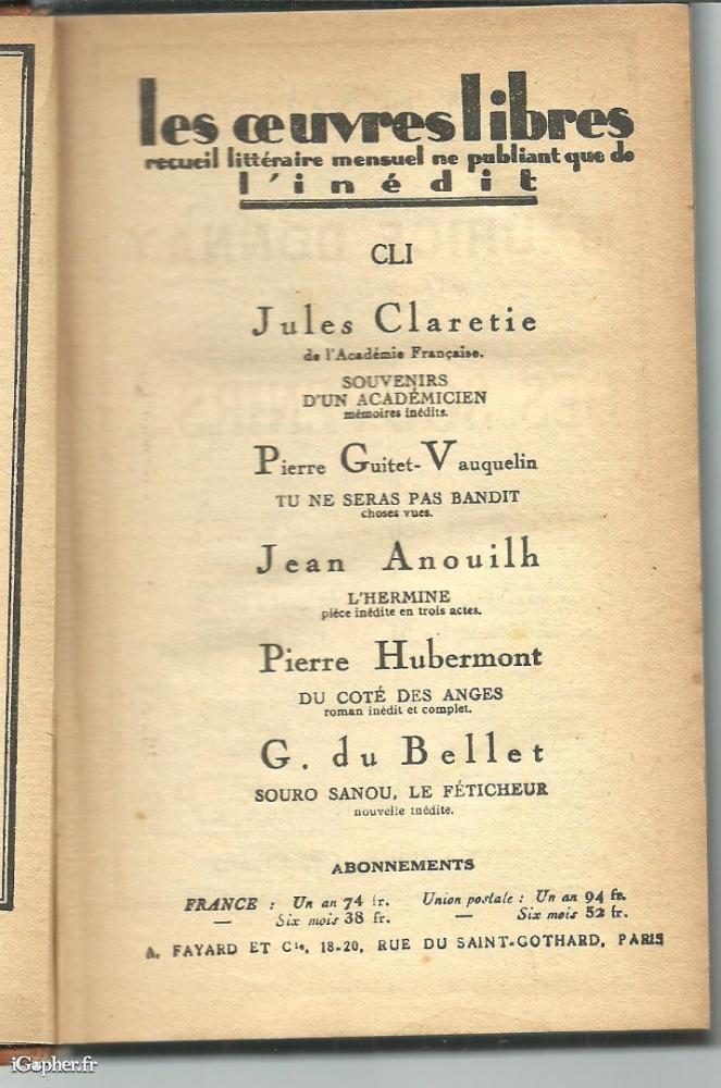 Ouvrage de la collection LES OEUVRES LIBRES, recueil littéraire mensuel ne publiant que de l'inédit, numéro 151.