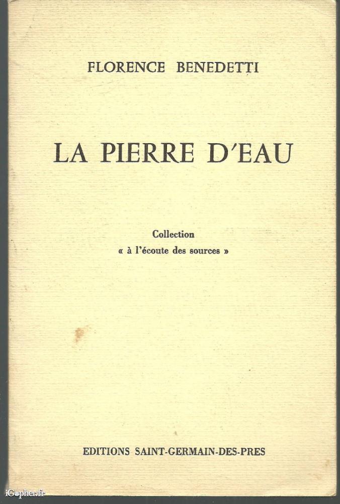 Livre de 56 pages, écrit par Florence BENEDETTI, il titre "La Pierre d'Eau". C'est une édition originale qui fait partie de la collection "A l'écoute des sources".