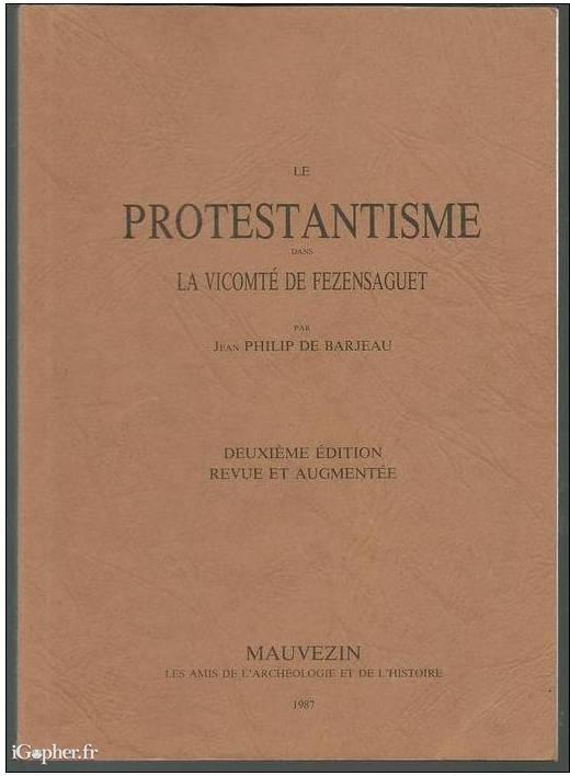 Un livre au long titre "Le protestantisme dans la Vicomté de Fezensaguet", écrit par Jean Philip de Barjeau.