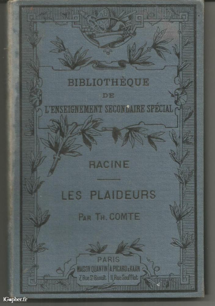 Un livre publié à Bibliothèque de l'enseignement secondaire spécial au titre de la 2ème année. Cet ouvrage titre : RACINE Les Plaideurs par Théodore COMTE, ancien élève de l'Ecole Normale supérieure, et professeur agrégé au lycée de Reims. Ouvrage conforme au programme du 10 aout 1886.