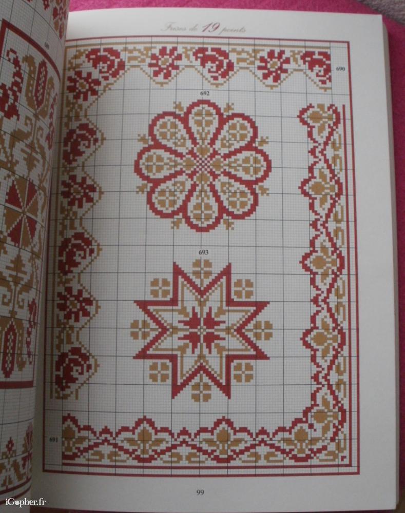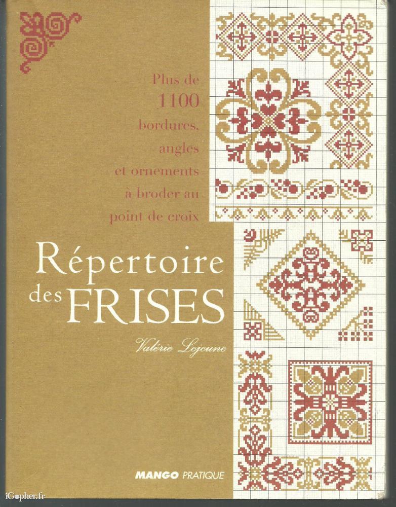 Un livre écrit par Valérie LEJEUNE, il s'intitule : "Répertoire des frises" et il comprend plus de 1 100 brodures, des angles et ornements à broder au point de croix.