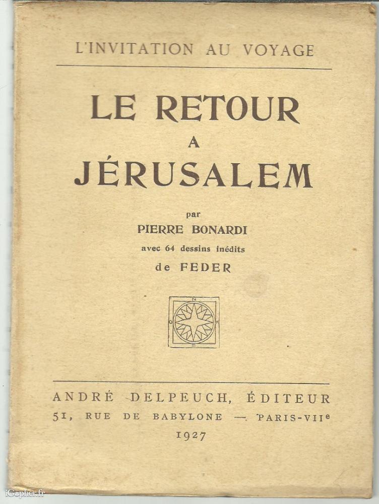 Ouvrage de la Collection "l'invitation au voyage", il titre "Le retour à Jérusalem", et a été écrit par Pierre BONARDI. Ce livre de 205 pages comprend 64 dessins inédits de FEDER. Ouvrage édition en 1927.