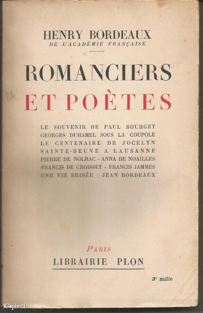 Livre écrit par Henry BORDEAUX, il titre "Romanciers et poètes".