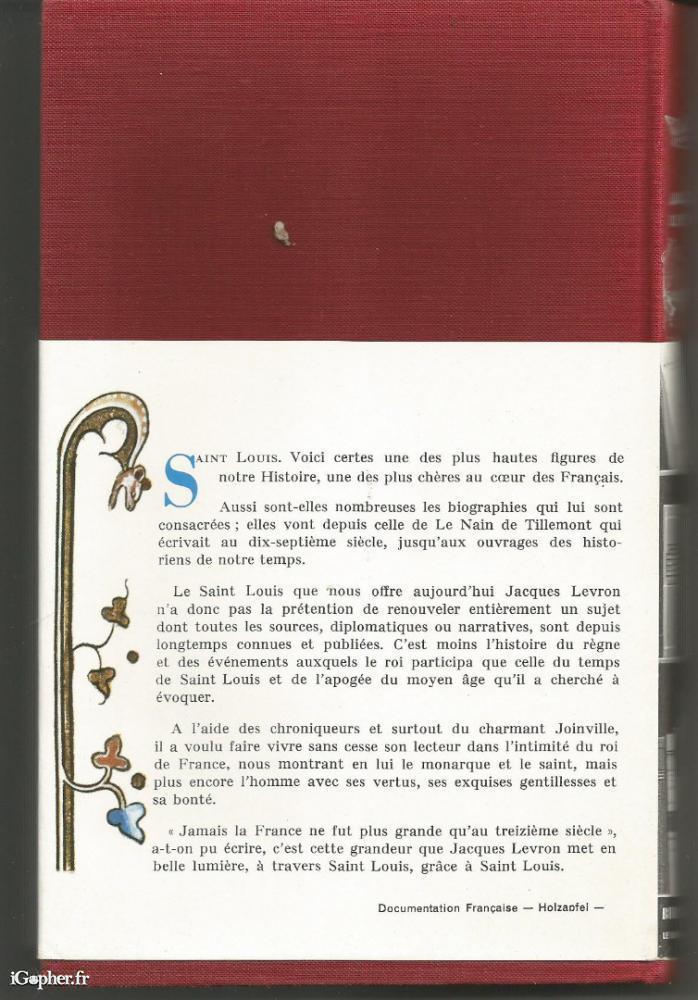 Un ouvrage de Jacques LEVRON, il titre "Saint-Louis ou l'apogée du Moyen-Âge". Présence de l'histoire, collection dirigée par André Castelot. Une édition Le Livre Contemporain Amiot Dumont publiée en 1957. Livre de 226 pages.