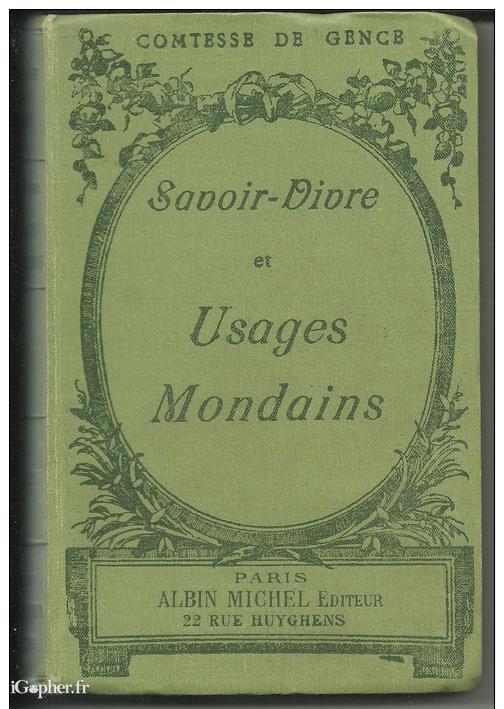 Un ouvrage écrit par la COMTESSE de GENCE, il titre : Savoir-vivre et usages mondains. Livre de 488 pages edité chez ALBIN MICHEL (pas de date d'édition mais début XXe).