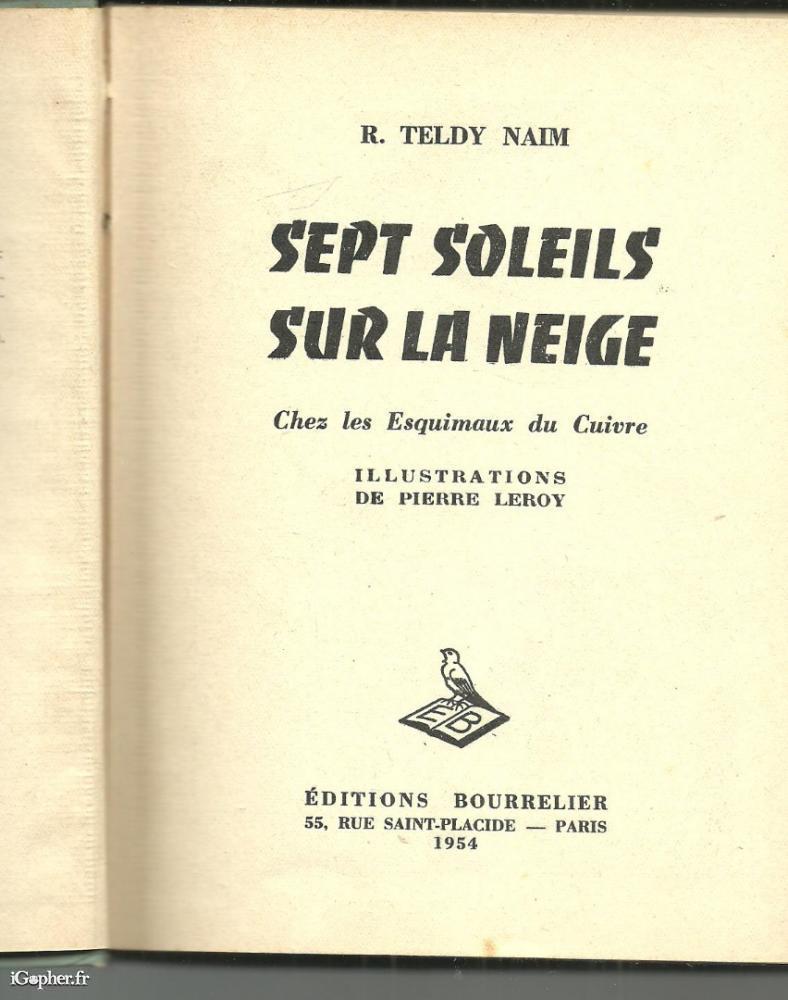 Ouvrage de l'auteur : R TELDY NAIM, il titre : "Sept soleils sur le neige : chez les esquimaux du cuivre". Prix jeunesse 1954. Illustrations de Pierre Leroy. 192 pages. Editions Bourrelier en 1954.