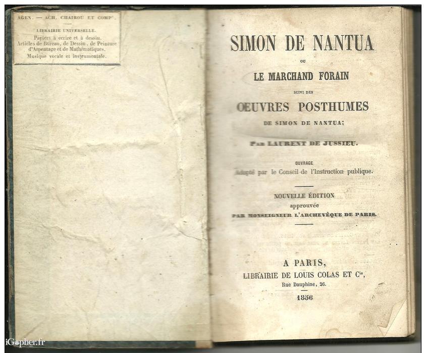 Cet ouvrage titre "Simon De NANTUA ou Le Marchand Forain, Suivi Des Oeuvres Posthumes" par Laurent de JUSSIEU. Ouvrage adopté par le Conseil de l'Instruction Publique. Nouvelle édition approuvée par Monseigneur l'Archevêque de paris. Un livre de 288 pages publié à la Librairie de Louis Colas et Cie, une édition de 1856.