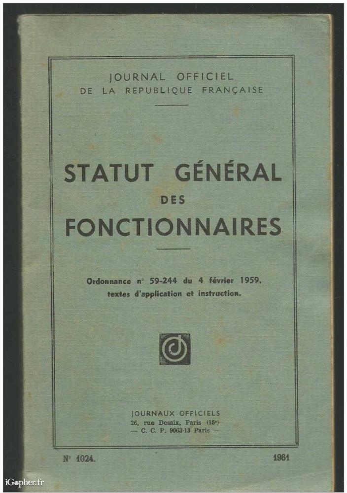 Cet ouvrage titre "Statut Général des Fonctionnaires", publié au Journal Officiel. Ordonnance n° 59-244 du 4 février 1959, textes d´application et instructions. Un livre de 158 pages publié le 1er novembre 1961.