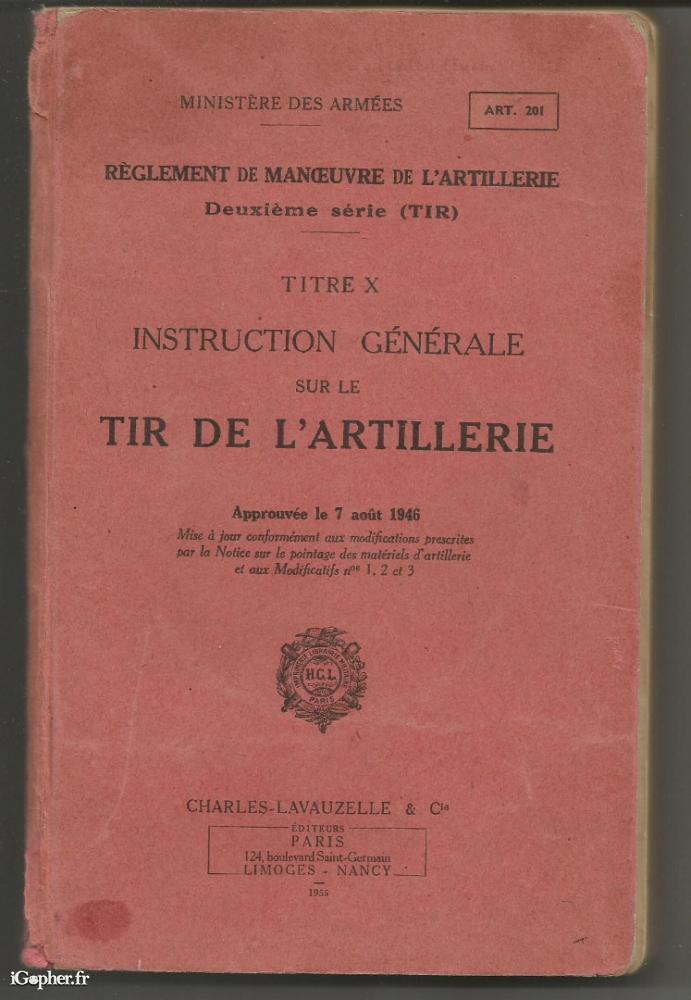 Un ouvrage du Ministère des Armées, il titre : Règlement de manoeuvre de l'artillerie - Deuxième série (TIR). Ttire X : Instruction générale sur le tir de l'artillerie"... Approuvée le 7 aout 1946, mise à jour conformément aux modifications prescrites par la Notice sur le pointage des matériels d'artillerie et aux modificatifs numéros 1, 2 et 3. Un livre de 345 pages.