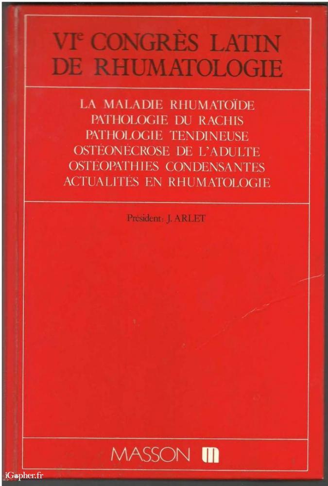 Cet ouvrage de 288 pages titre : VIe CONGRES LATIN de RHUMATOLOGIE dont le président était J. ARLET. Edité en Septembre 1984, ce livre est paru aux édtiions MASSON.