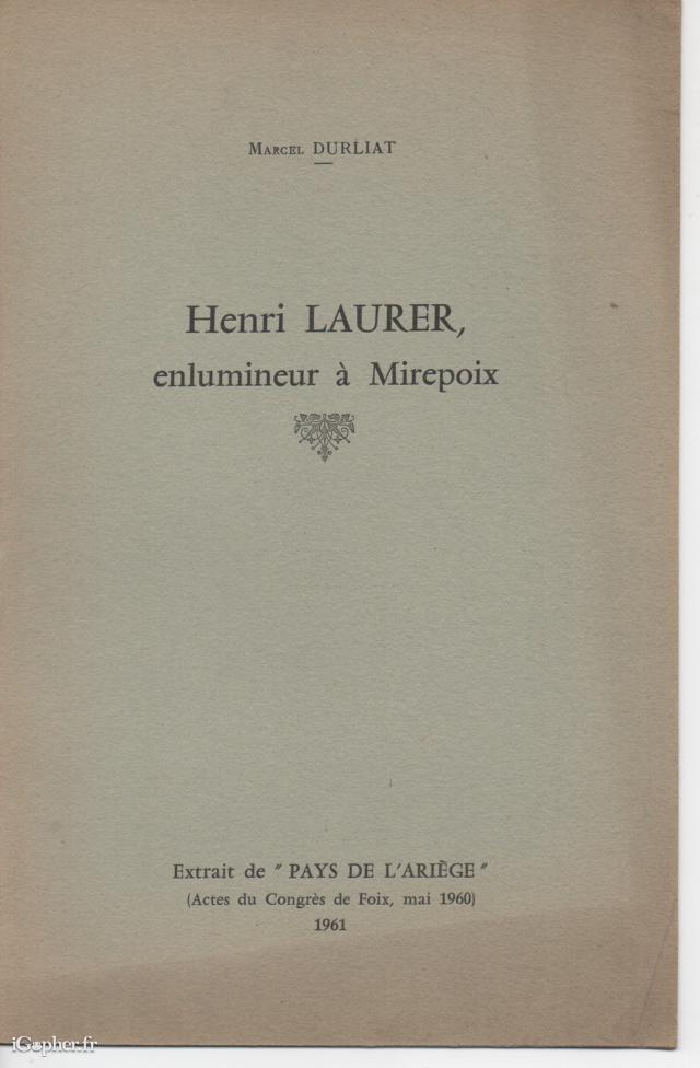 C'est un livret introuvable de Marcel DURLIAT (1917 - 2006), un historien de l'art et spécialiste incontesté de l'art médiéval du Sud de la France et de l'Espagne, qui s'intitule "Henri Laurer : enlumineur à Mirepoix".