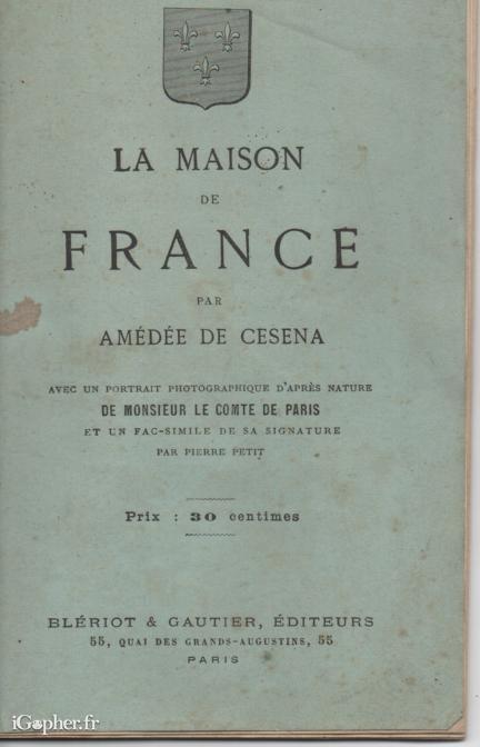 Cet ouvrage titre : LA MAISON DE FRANCE, il a été écrit par Amédée de CESENA, avec un portrait photographique d'après nature de Monsieur le Comte de Paris et un fac-simile de sa signature par Pierre Petit.