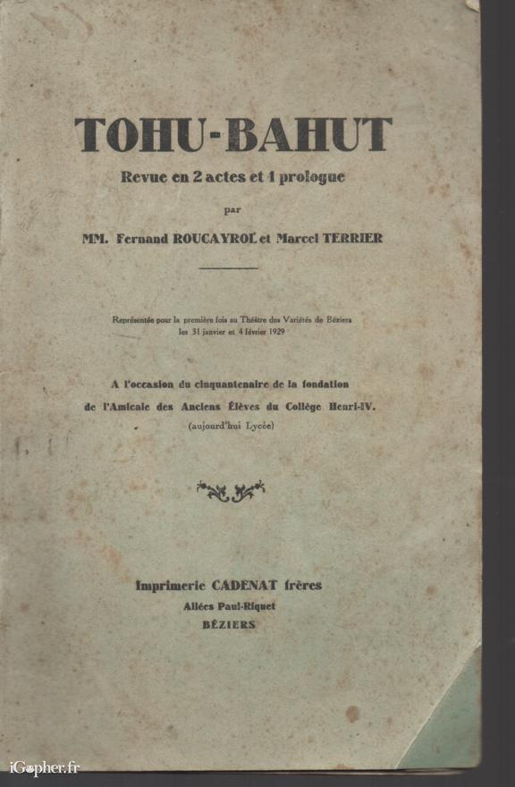 Ce livre titre : TOHU-BAHUT Revue en 2 actes et 1 prologue, écrit par MM Fernand ROUCAYROL et Marcel TERRIER.