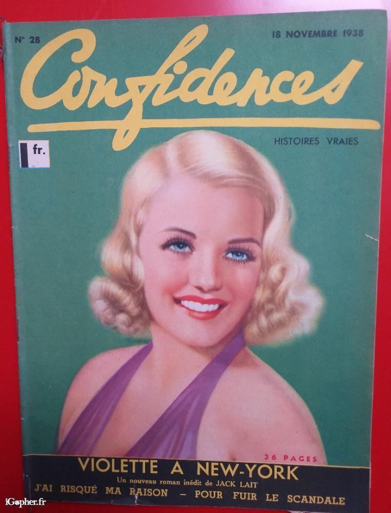 Ancien numéro du magazine CONFIDENCES qui parait tous les vendredis. Numéro 28 du 18 novembre 1938. Cette revue titre : Violette à New York.