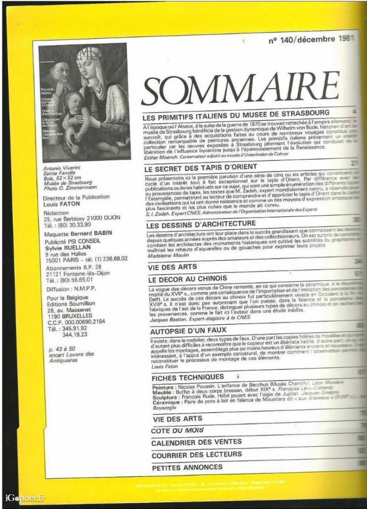 Le magazine "L'Estampille" est une revue mensuelle de 82 pages. Il s'agit ici d'un ancien numéro (N°140), publié en Décembre 1981.