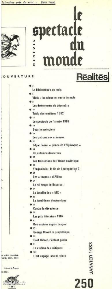 Revue de 104 pages traitant de différents sujets d'actualité. "Le Spectacle du Monde" est un magzine français, il s'agit ici d'un ancien numéro (N°250) qui date de Janvier 1983.