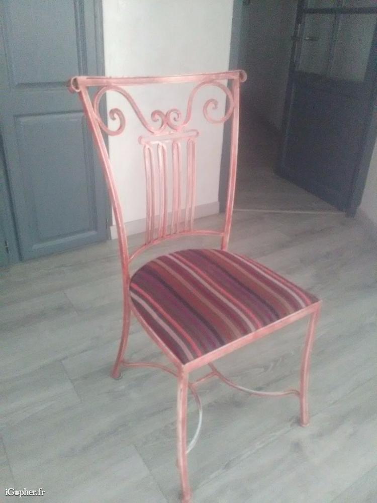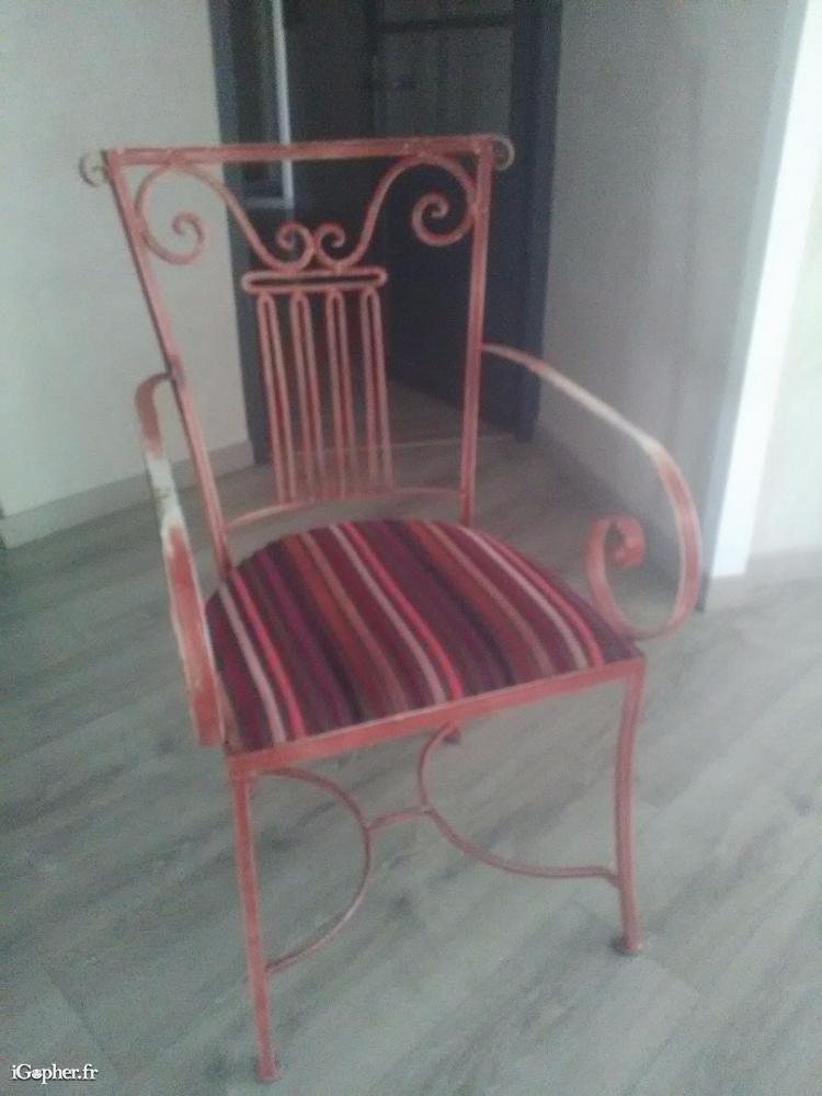 Un ensemble comprenant : une table (1 x 2 m), plateau en bois piétement fer forgé rouge avec quatre chaiese et deux fauteuils aux pieds en fer forgé rouge et une assise en galettes de tissus.