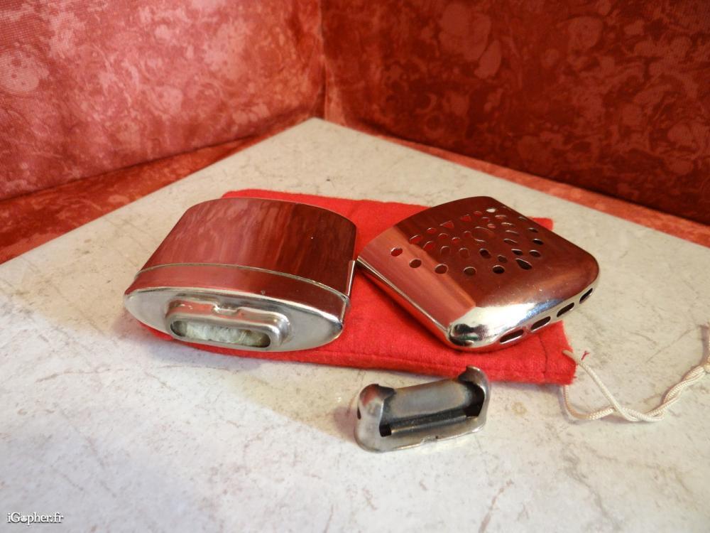 La chaufferette de poche produit de la chaleur non pas par la combustion directe de combustible, mais par l'oxydation progressive du combustible volatilisé, sous l'effet de catalyse du platine. Matière laiton et nickel. Avec sa housse de protection.