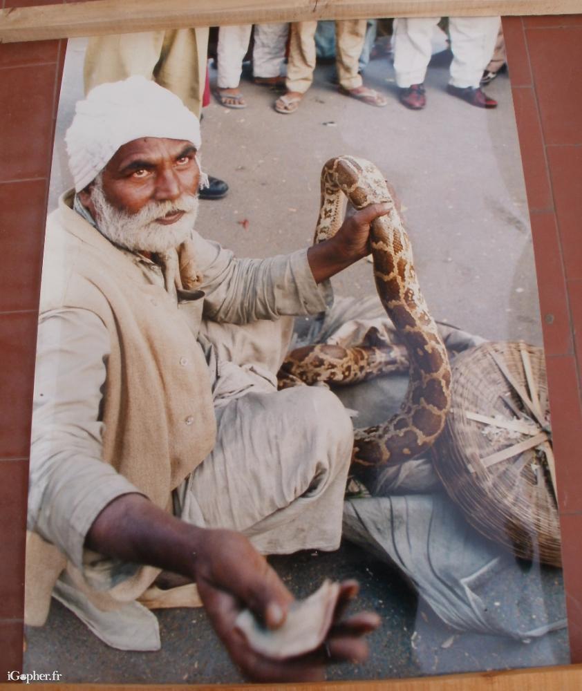 Une grande photographie d'un charmeur de serpent. C'est un tirage argentique.