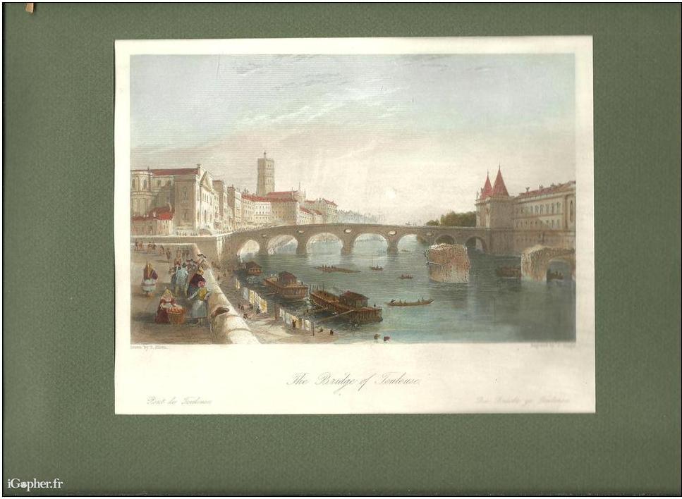Une gravure : "Le Pont de Toulouse" (The bridge of Toulouse), d'après un dessin de Thomas Allom.