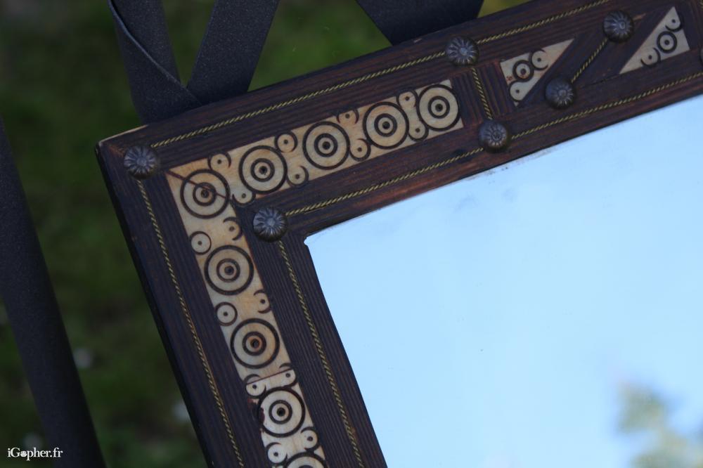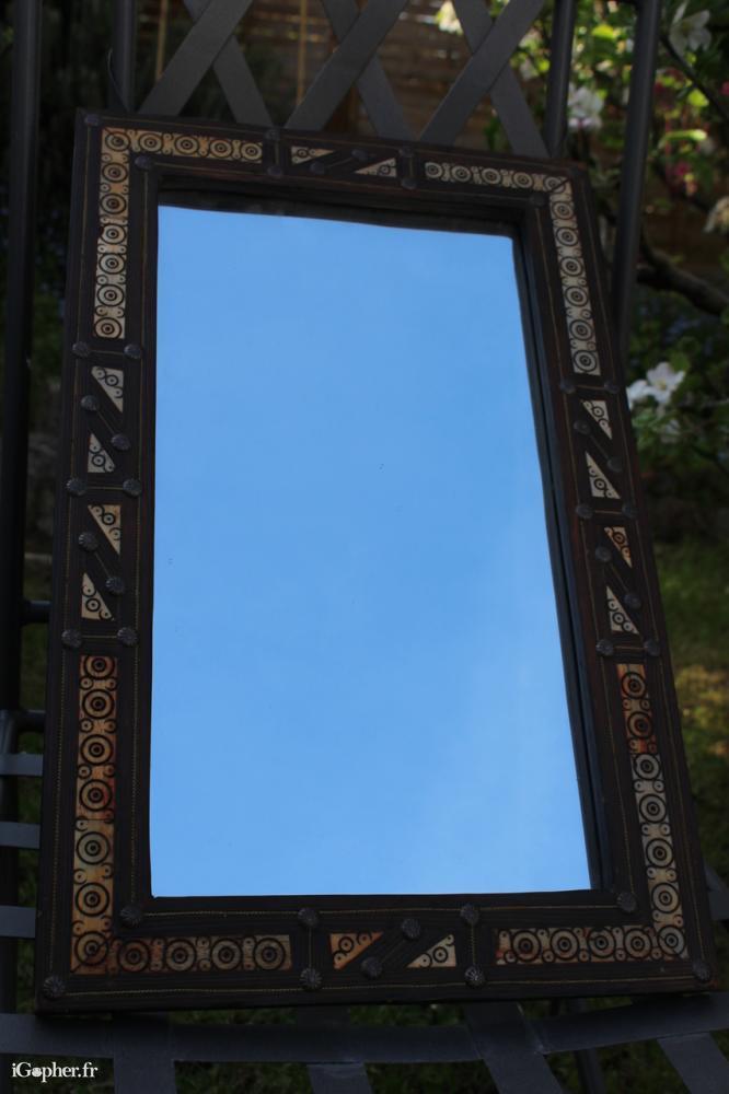 Un miroir marocain, il es en bois exotique (avec des motifs en d'os de chameau).