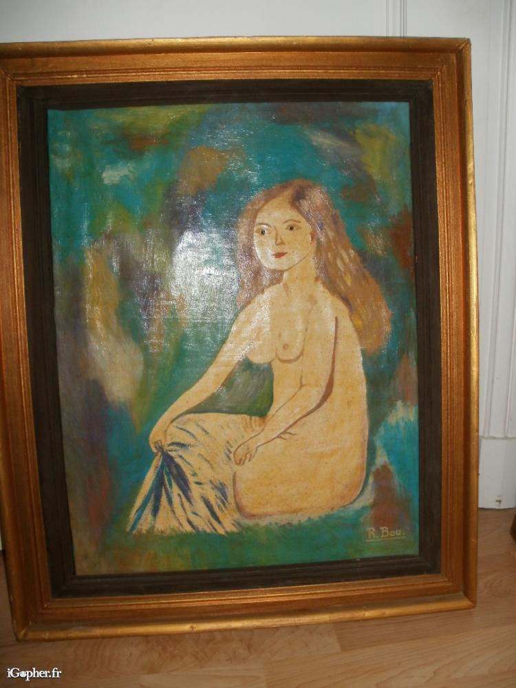 Tableau d'une peinture huile sur toile signée R. BOU, peintre local du LOT et encadrée. Il s'agit de son 62ème tableau qu'il a intitulé "La baigneuse 1880".