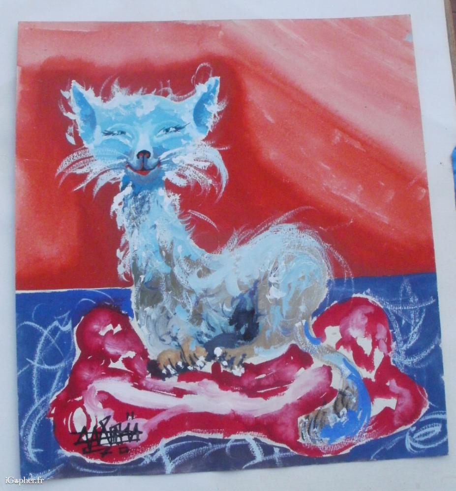 Une peinture sur papier Canson, représentant un chat qui semble assis sur un coussin. Elle est signés mais la signature est peu lisible.