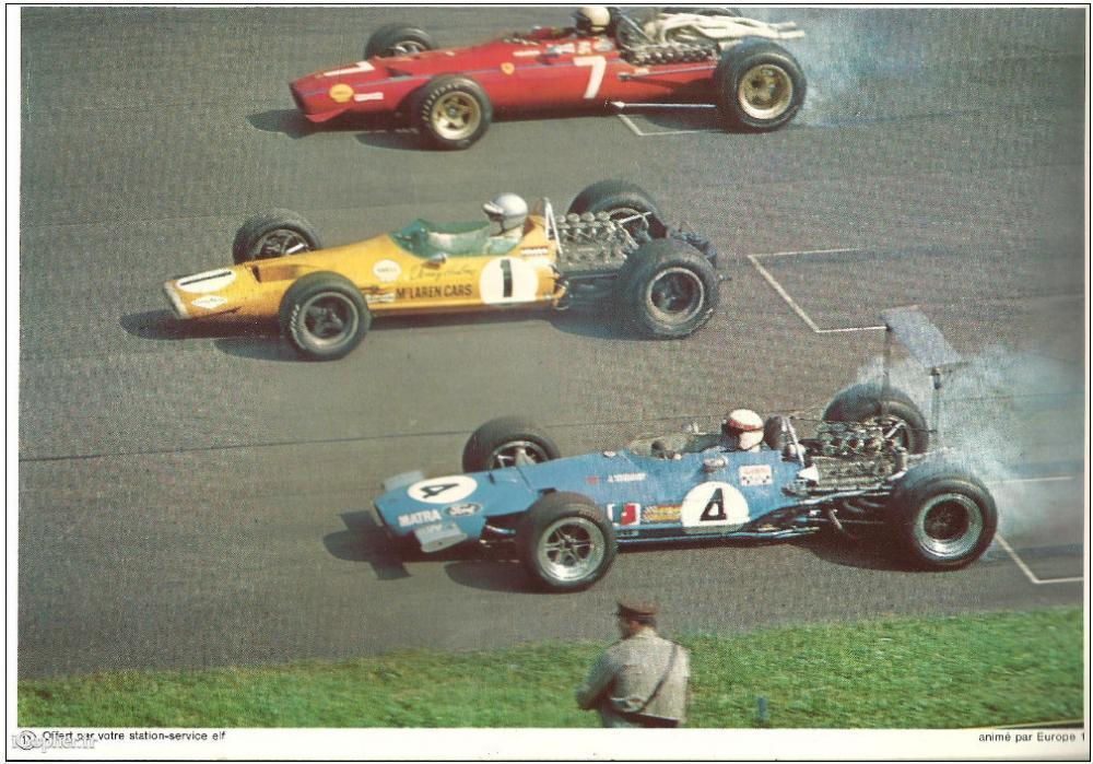 Une publicité pour la compétition automobile ELF, de 1970. Photo MATRA tue MS 10, N°17. Collection offerte par votre stations-service ELF, animé par Europe 1. Au verso, son histoire et ses caractéristiques techniques.