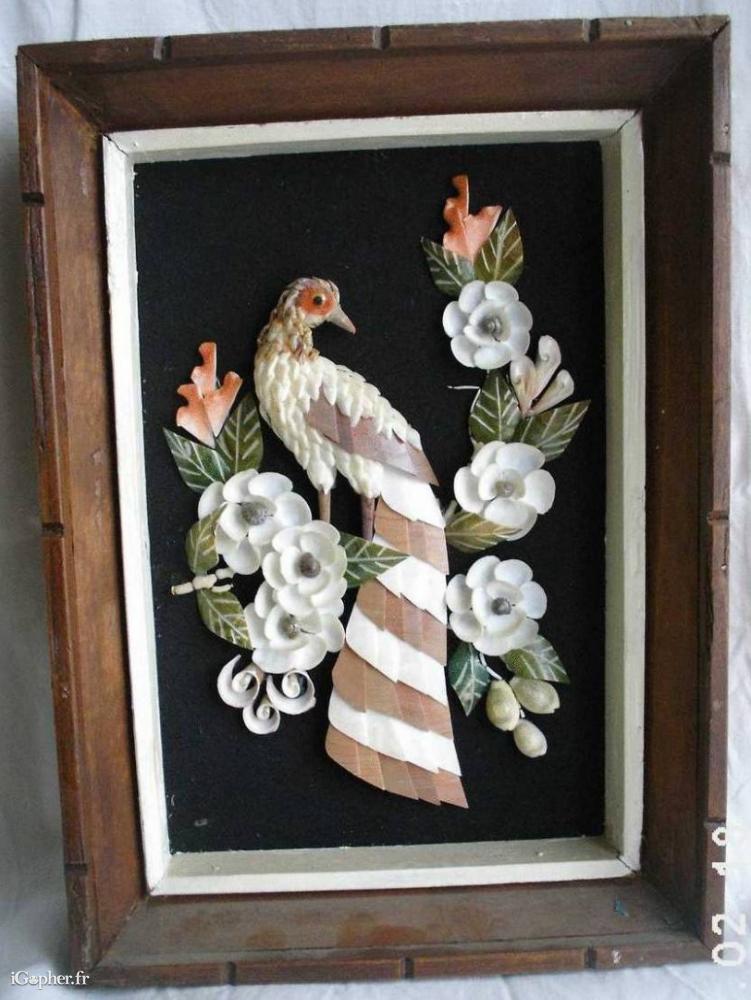 Un tableau artisanal avec une perruche en relief. Il est de type chinois, fabriqué essentiellement avec des coquillages.